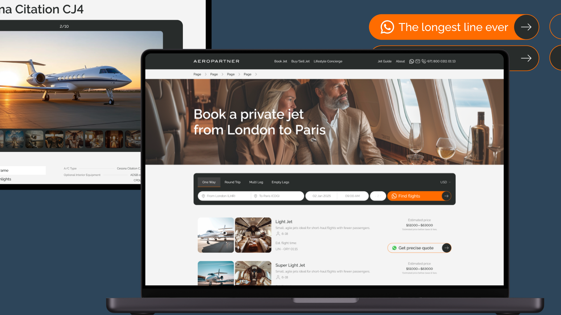 Led end-to-end UX for private jet charter platform, conducting research and designing complete booking journey with design system. SEO agency called it "best collaboration with a designer" for balancing user experience with technical constraints.