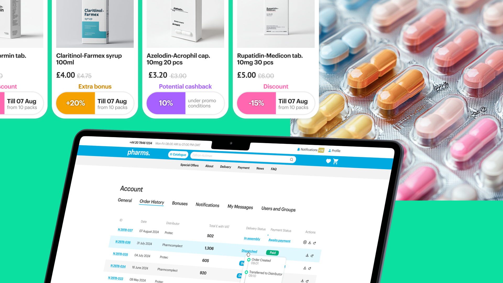 Redesigned pharmaceutical procurement platform's catalog and order tracking for 150+ pharmacy partners. Product Manager: "Finally everything is clear and understandable, good navigation and layout."